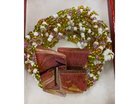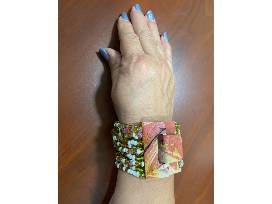 Beaded cuff, white, pink, green with hand-painted wooden closure.