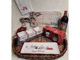 Use these basket items to serve your holiday meal of decorative serving platter, 3 set of serving dishes, a cutting board, decorative wine glasses and a bottle of Christkindl wine.