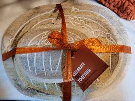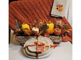 Spread fall decor around your house with this basket filled with a super soft crocheted blanket, fall themed centerpiece with battery operated candles, carved wooden pumpkin serving bowls and pumpkin hand towels.