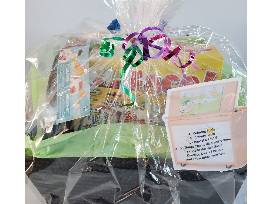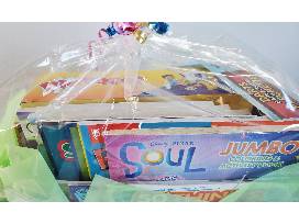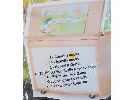 This basket is filled with activities for children including coloring books, activity books, Pie in the face game, crayons, colored pencils and more!