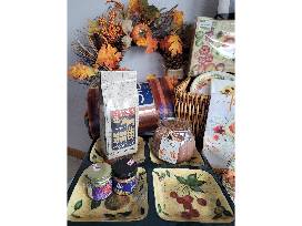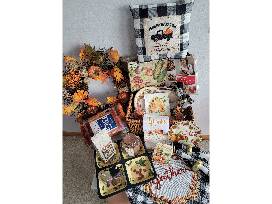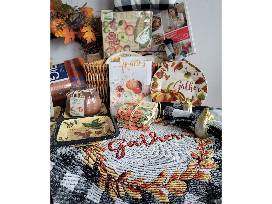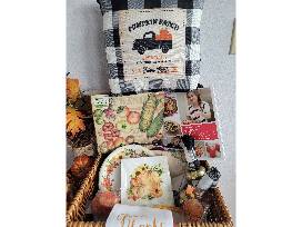 This basket is packed with everything you need to get your house ready for Thanksgiving including place mats, napkins with pumpkin rings, serving dishes, a cook book, pumpkin wreath, fuzzy throw blanket, a candle, a throw pillow and more!