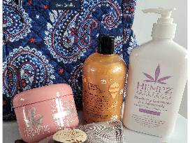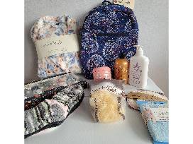 This Vera Bradley backpack is filled with everything a women needs to pamper herself. A fluffy robe, 3 pairs of fuzzy socks, mesh bath scrubbies, bath sponge and body luffas, creamy body mask, body moisturizer, shampoo, body wash, shower gel combo along with a set of hand creams.