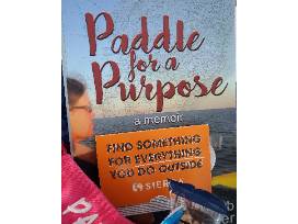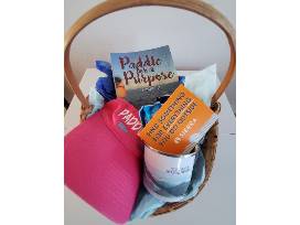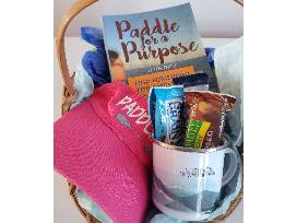 This paddle sports basket includes a signed copy of Barb Geiger's Mississippi River memoir, Paddle for a Purpose, paddle sport visor, mug and gift certificate to Sierra Trading Post.