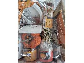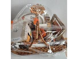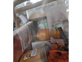 This basket is filled with Thanksgiving table settings along with various Thanksgiving decorations including candles and a wax warmer.