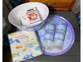 This serving set and glasses with a tranquil fish print will serve up drinks and snacks beautifully on your patio! Included is a vinyl tablecloth and a photo frame, all with a fish theme. Dishes are melamine/plastic.
