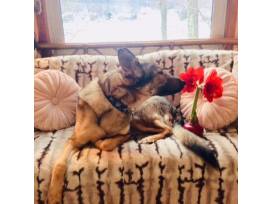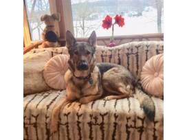 Dublin, a silver sable three year old, is always ready to please and is exceptional when it comes to following his Guide commands. When NOT working, he is sweet, silly, and affectionate. He has three different beds, and manages to sleep in all three every night. Living on a lake means swimming is the most fun... after eating and taking walks ANYWHERE. He has the soul of an angel and the heart of a saint. He is easy to love.