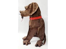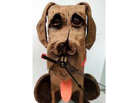 Owned and donated by an avid art collector, this one-of-a-kind piece of art can be yours. This beautiful, unique creation is made out of paper mache. This handsome boy holds a clock in his mouth while his eyes emit puppy love.