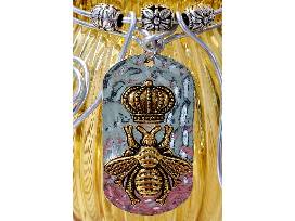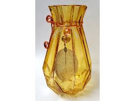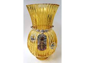 Gold glass ribbed vase decorated with a crown been charm, silverwire and beads.