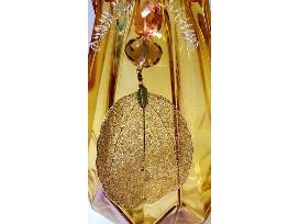 Gold glass vase decorated with copperwire and a gold leaf charm and beads.
