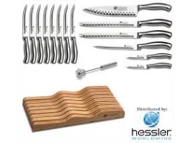 One of the finest and most complete cutlery sets in the world. All the knives are made of surgical stainless steel and are guaranteed to hold their edges for years to come. The In-Drawer Organizer is made of environmentally friendly Rubberwood and will keep your knives safe, sharp and neatly organized in your kitchen drawer. The Hessler Worldwide Gourmet Plus series 17 piece set with bonus cutting board, sets new standards in kitchen cutlery and is guaranteed for a lifetime of trusted use.