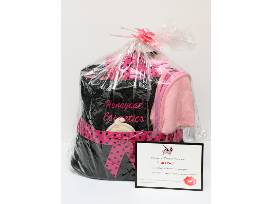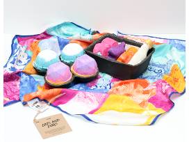 $100 gift certificate for nail services at Clover Nails, a spa bag from Honeycat Cosmetics including a variety of spa essentials, nine bath bombs and bubble bars as well as a "Cats and Dogs" scarf from Lush cosmetics, and a $50 gift certificate to Breeze Salon & Spa