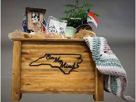 The maple and pinewood box was handmade and it is ideal for storing lap blankets - like the one that is included! There are also too many N.C. items to name - aprons and caps, ornaments, maps, towels, a cutting board, and a yummy yummy bottle of Blueberry Wine. This is a veritable treasure trove and you will enjoy unwrapping each and every thing. And that beautiful pine? It will thrive in your home (even if its first name is Kentucky).