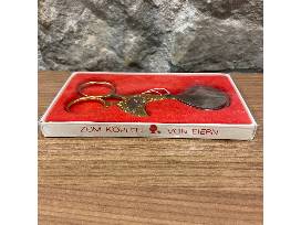 Vintage egg knife with golden chicken design, used to cut off the top of a soft boiled egg.