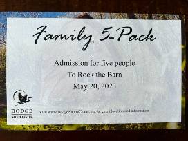 Enjoy two family 5-packs of tickets (10 total) to their two big events: Rock the Barn in April and Halloween Extravaganza in October. Plus Dodge swag that includes two Dodge t-shirts, carabiner, pens, key clips and stickers.
