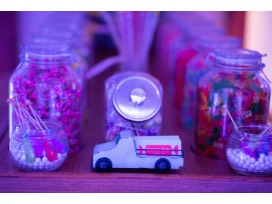 Rent this adorable Mini Mobile Candy Store for your next event! Scoop and mix your favorite candies from 14 of their delicious candy bins.