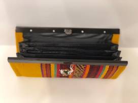 0This is a handmade Bolivian Alpaca wallet with a metal clasp. Four separate pockets inside with one zippered pocket. Made with the popular aguayo woven fabric from Bolivia.