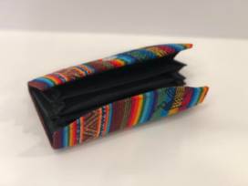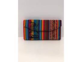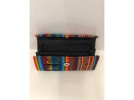 0This handmade Bolviian wallet is made of aguayo cloth, a very popular textile in Bolivia. This wallet has a magnetic clasp and four pockets and a zippered pouch inside.