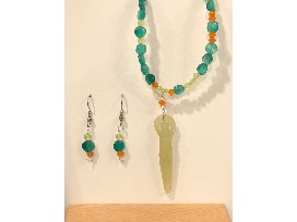 Faceted green onyx coins sparkle brightly on this unusual necklace featuring a dainty stone Goddess pendant. Contrasting with the green are faceted orange carnelian and lime green peridot beads. The 17" necklace is finished with a sterling heart-shaped toggle clasp.
