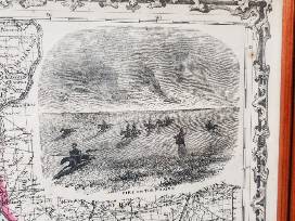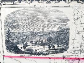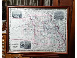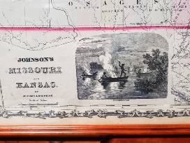 From Johnson's New Illustrated (Steel Plate) Family Atlas New York: Johnson & Browning (ca 1860/61) Hand-colored lithographed county map of Missouri and Kansas circa 1861. Three decorative vignettes showing Santa Fe from the Great Missouri Trail, Spear Fishing, and Fire on the Prairie. Paper dimensions are roughly 23 ½ x 18 inches. Nicely framed with dimensions of 25 ½ x 20 inches.