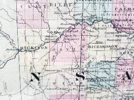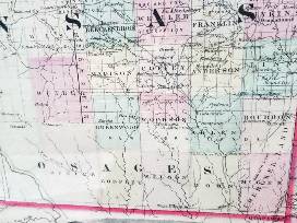 Map shows Calhoun County which became Jackson in 1858; Richardson County which became Wabaunsee in 1861; Breckenridge County becoming Lyon in 1862; and Weller County that became Osage in 1859. Out west, we find Davis County which was the last to have a name change becoming Geary in 1888. In the southeast corner of Kansas are the large counties of McGee (Crawford and Cherokee Counties in 1860);