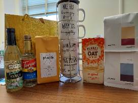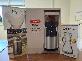 OXO Conical Burr Grinder, 3 cup glass Chemex brewer, 100 Chemex cone filters, Bonjour 8 cup French press, Gracenote Altura Espresso (12 oz) Oz, Gracenote Misty Valley Ethiopia (12oz), Devocion El Sol (12 oz), Planet Oat Oatmilk (32 oz), Torani Vanilla Syrup (12.7 oz), Powell & Mahoney Simple Syrup (12.68 oz), 4 ceramic mugs