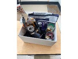 Enjoy a growler, glasses, coozies, golf tees, face gaitor, can cooler, and coasters.
