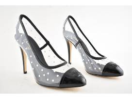 You can't go wrong with these classic, chic Chanel pumps! These are Chanel Black 18 Patent PVC and Pearl Sandal Stiletto Heel Pumps.