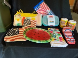 30 qt green Igloo Brand cooler; Picnic blanket; flip flops size 7/8; US Flag paper plates; US Flag table covering; US Flag napkins; Wine themed napkins; Watermelon paper plates; Country Time Lemonade Mix; Country Time Half and Half mix; fruit themed kitchen towel; (3) Rubbermaid Take Alongs