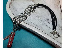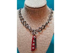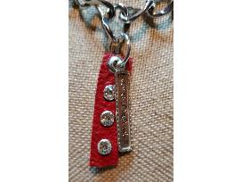 Red 100% leather tag with white rhinestones. Stamped silver tag SOLIDARITY. Silver chain and black leather cord. Toggle clasp.