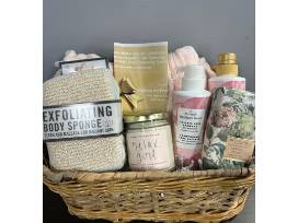 Decorative basket with wrap towel, body exfoilating sponge, relaxation candle, scented bar soap, shampoo & conditioner