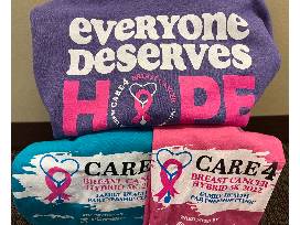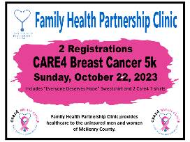 The Care4 event is McHenry County's largest 5K run/walk and is organized by the Family Health Partnership Clinic to raise money for breast cancer screenings, education, outreach and other services for women and men who are uninsured. Also included are a pair of pink socks, 2 Care4 T-shirts, and an EVERYONE DESERVES HOPE hoodie sweatshirt.