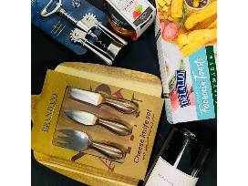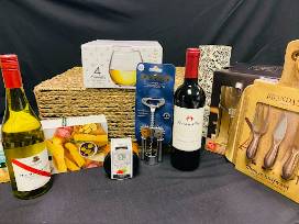 This beautiful black-and-white wine basket has everything you need to create a memorable evening sipping and snacking at home. Package includes two bottles of wine - a 2017 Menage a Trois cabernet sauvignon and 2018 bottle of The Hermit Crab viognier marsanne, focaccia toasts, a beautiful cheese knife and cutting board set, red pepper and artichoke bruschetta, four Isaac Mizrahi stemless wine glasses, four Luxion wine glasses, a corkscrew and black cocktail napkins.