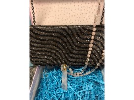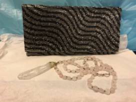 0You'll be the hit of the evening with two lovely accessories. The Sondra Roberts black and steel grey beaded clutch will bring a pop of sparkle to any ensemble, while the clear and rose quartz necklace from designer Aviva Stanoff will add a touch of understated elegance. Each necklace is individually handmade and no two are alike. The look is versatile and timeless.