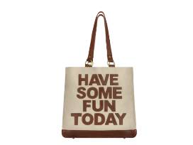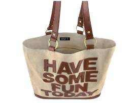 Make the Elaine Tote in Ivory Canvas & Luggage Leather yours today! This tote by Have Some Fun Today is one of our best selling sustainable tote bags. Made from recycled cotton canvas and a buttery soft leather. Fully lined in recycled cotton, this tote bag has multiple pockets, including a luggage slip on the back of the bag for travel ease. Fine leather straps, applique and a leather bottom along with sturdy and elegant brushed gold hardware make this a great tote bag. Bag measures: 14" H X 17" W X 3" D.