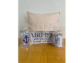 Take home numerous items for your Fairfield home today! Includes a Fairfield sign from Vintage Garden, a Fairfield zipcode pillow from 299, a wine tumbler monogrammed with Fairfield and a water tumbler monogrammed with an anchor from Everything Labeled AND three amazing candles from b. young handmade.