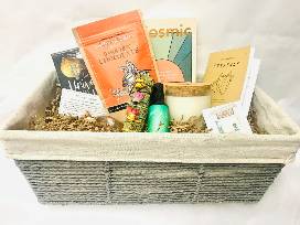 Gift basket to Jewelweed gift shop in Wayzata. Lined gift basket wtih crystal, candle, deck of cards, book on crystals, bundle of sweet grass, Cosmic book, Mist spray, and Dark Hot Chocolate