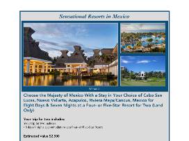 - Mexico trip- Receive an 8 day/7night stay at a 4 or 5 star resort in your choice of Cabo San Lucas, Nuevo Vallarts, Acapulco, Riviera Maya/Cancun (Land only, airfare not included) $2500 estimated value