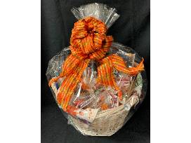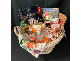 T41. Two bottles of Bernhardt Winery wine - Antiquity Sauvignon Blanc, 750 ml and Crimson (a semi-sweet red), 750 ml; 2 wine bottle openers, 4 stemless wine glasses, 4 cloth napkins with matching hand towel, book "Platters and Boards" by Shelley Westerhausen (a how-to book on creating a charcuterie board), parchment leaves for the board, small jar of olives, and a very small jar of strawberry jam.