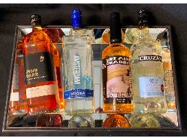 T28. Everything you need to get your bar started. Bottle of Cruzan Rum, 1 ltr, 40% ALC; John Barr Scotch Whiskey, 1 ltr, 40% ALC; New Amsterdam Vodka, 1 ltr, 40% ALC; The Ready Rabbit Simple Bar Syrup, 1 ltr; with a mirrored tray.