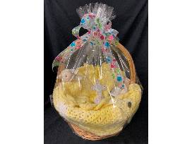 T31. This lovely yellow crocheted 5 piece layette (blanket, sweater, hat, booties, mittens) is handmade and nestles two Precious Moments figurines - 2004 Count Your Blessings and 2005 You Are a Child of God - and a small stuffed lamb.
