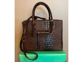 T16. This large (13 in wide x 11 in tall) dark brown stylish leather tote has both handles and a shoulder strap. Lots of pockets, inside and out.