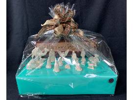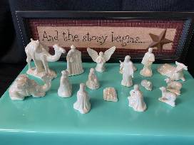 T13. This lovely 16 piece ceramic nativity set has a pearlized finish. The largest (the camel) is just over 4 inches tall. Baby Jesus is about 1 1/2 inches long. Also included is an 18 1/2 inch framed "And the story begins..." wall hanging.