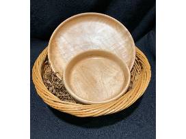 T88. Hand crafted by a SILCC Parishioner, this platter and bowl set is made of figured maple, a durable wood general found in the northeastern US and Canada. Figured maple is characterized by chatoyance, wonderful grain