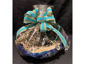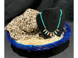 T37. This one of a kind 18 1/2 inch necklace is handcrafted by skilled artisans from vintage china. The polyester sun hat is from Cara of New York.