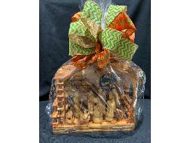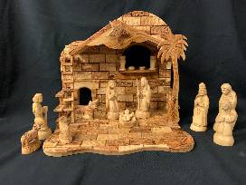 T60. Large Musical Olivewood Nativity Set from Jerusalem measuring 11"x16"x15" with 11 pieces the tallest 6"