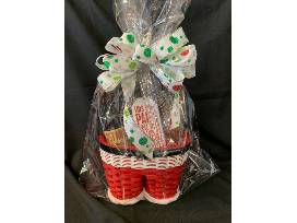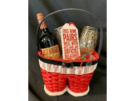 T28. Lost Angel 2016 Cabernet Sauvignon, 750 ML, 13.5% ALC; 2 elegant holiday wine glasses, and an ornament: "This Wine Pairs Well with Beef, Lamb, and Difficult Relatives". All in a cute "Santa's bottom" basket.