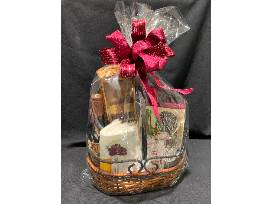 Apothic Red Blend Wine 750ml, Lost Angel Cabernet Sauvignon 750ml, 7 packs of paper cocktail napkins, 2 wine glasses, 10 embroidered cloth napkins, 2 packs of 8 Note Cards, package of 20 coasters, 1 oven mitt, and wine carry case.