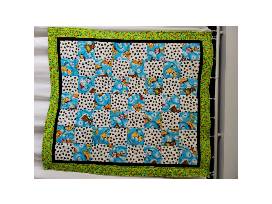 Machine pieced and quilted patchwork blanket measures 39.5" x 44". The mottled green backside is a high quality (quilt store) flannel. All materials are 100% cotton. Minimum shrinkage will occur with washing which will give the quilt a slightly crinkled charm. Machine wash in cool water, tumble dry low heat.