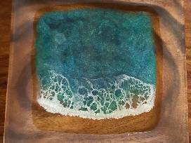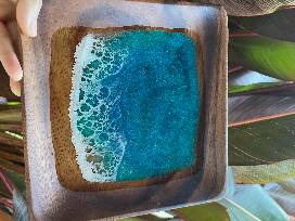 This gorgeous piece of functional artwork is a square 8"X8" Acacia wood bowl with a resin ocean created by Best Buddies in Hawai'i supporter Leilani Kepler. Enjoy the beautiful and calming blues and whites of the resin center that will ensure you can always keep the ocean close by.