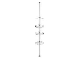 Reinforced aluminum tension pole with high-compression spring and grippy rubber feet, extends from 6 to 9 feet to fit most showers and bathtubs. Adjustable wire-frame shelves allow you to customize your shower caddy. Constructed from stainless steel and anodized aluminum.